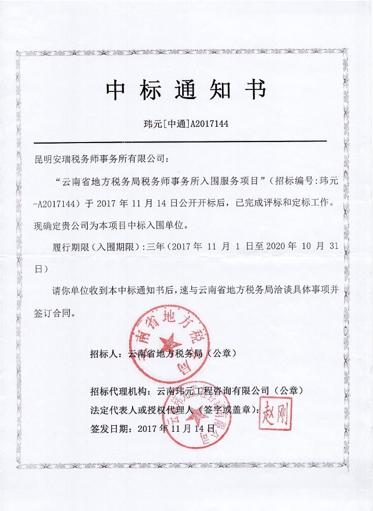 安瑞事務(wù)所是云南省地方稅務(wù)局的入圍事務(wù)所之一